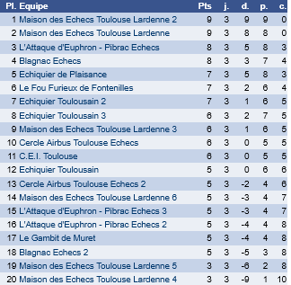 D’organiser cette Coupe à domicile nous a permis pour la première fois d’engager deux équipes du club. Le but premier était de s’entraîner, de jouer. Nous avions tout de même une équipe forte pouvant prétendre à la qualification... Mission accomplie puisque Blagnac fait partie des équipes qualifiées pour la seconde phase qui devrait se jouer au mois de mars... Il y avait 5 qualifiés possibles et Blagnac Échecs termine quatrième !
